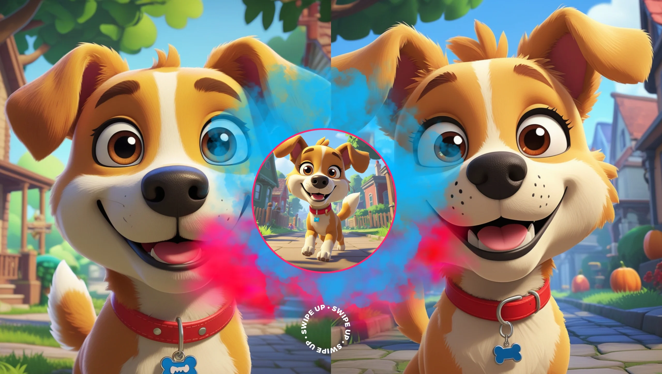Chase is leaping forward with excitement, ears flying back and a playful grin on his face