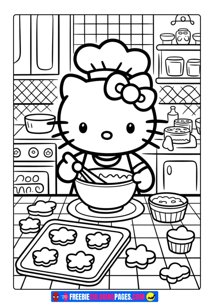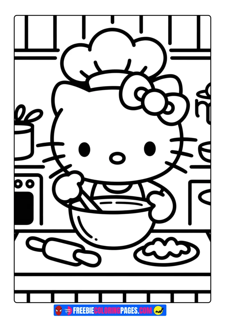 Hello Kitty baking in the kitchen, holding a mixing bowl and spoon