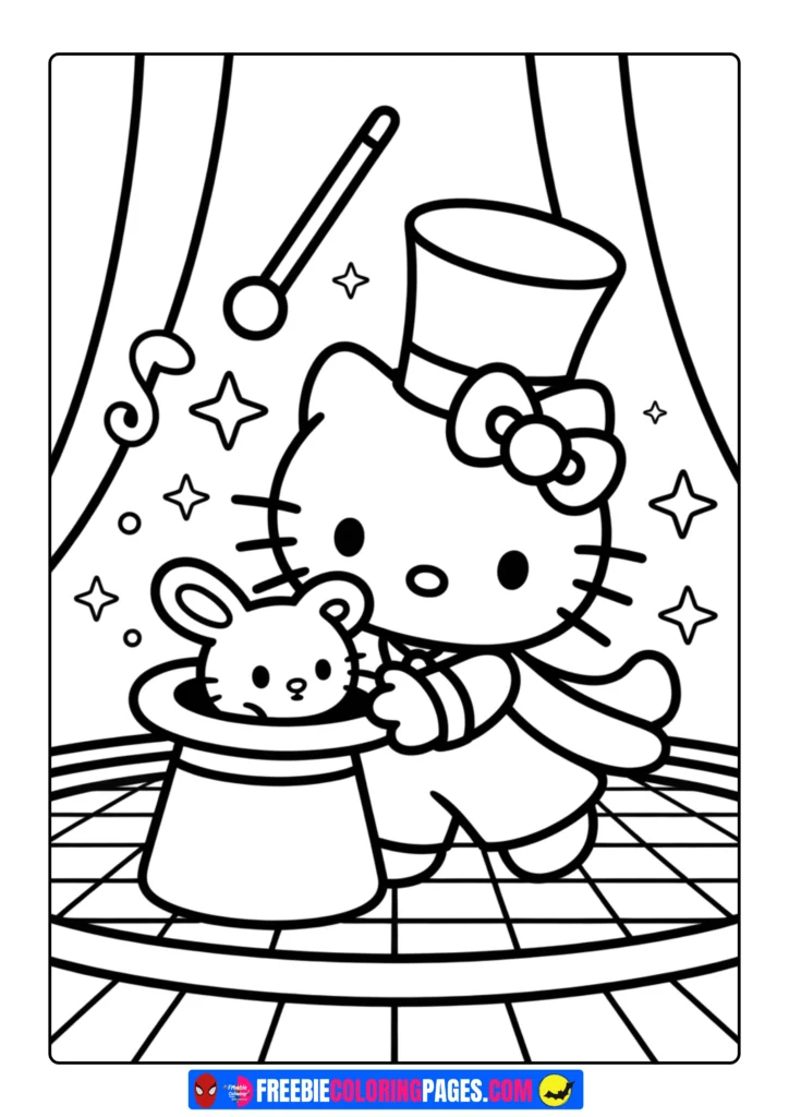 Hello Kitty dressed in a magician outfit, pulling a bunny out of a hat