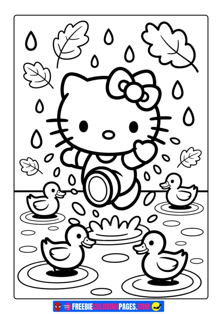 Hello Kitty holding an umbrella, jumping in puddles on a rainy day