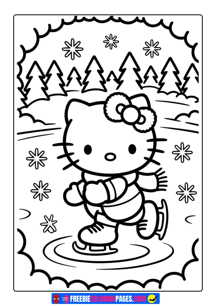 Hello Kitty ice skating on a frozen pond wearing earmuffs and scarf