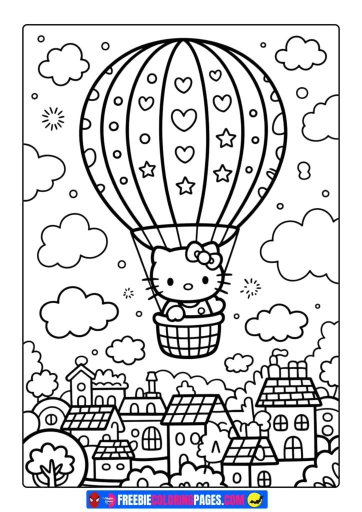 Hello Kitty in a hot air balloon, floating above a cartoon town