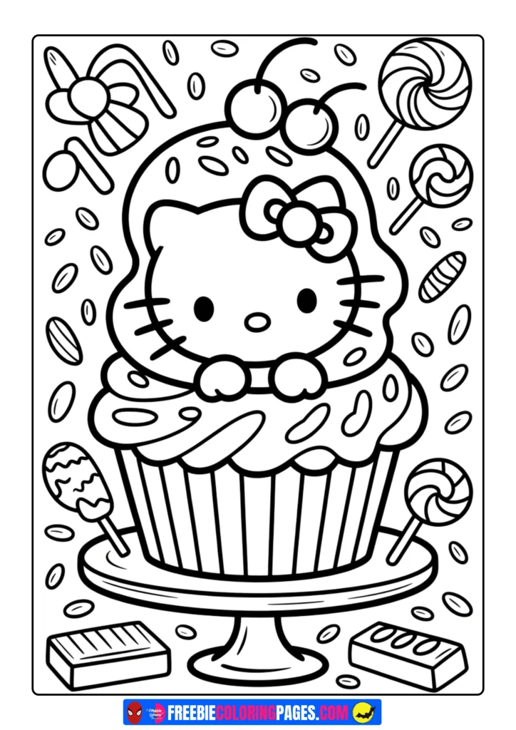 Hello Kitty sitting inside a giant cupcake with sprinkles, cherries